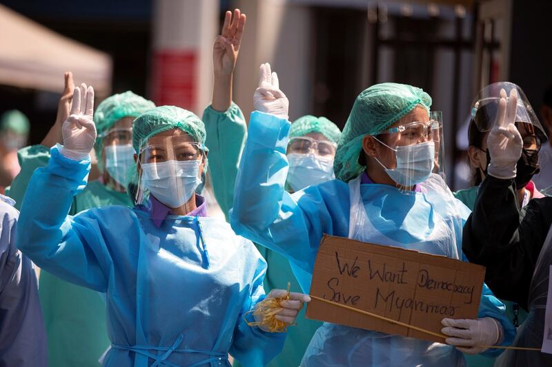 Medical workers rally in Yangon against the military coup in Myanmar and demand the release of Aung San Suu Kyi, Feb. 10, 2021. Credit: Reuters