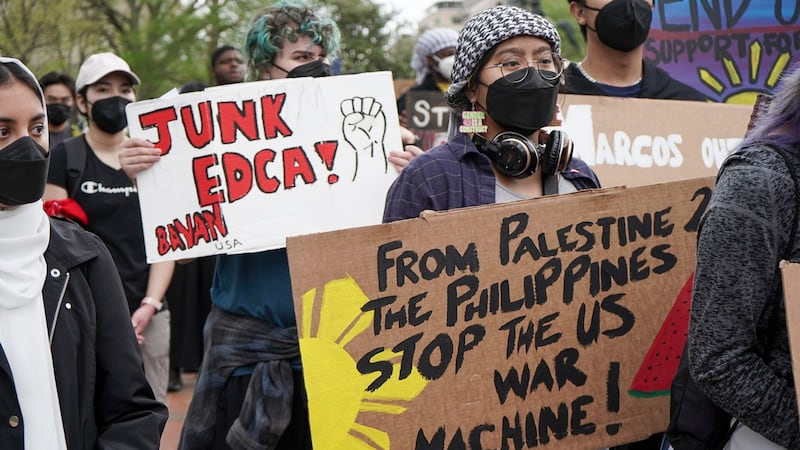People protest against the Marcos administration’s 2023 decision to grant the United States greater access to military bases in the Philippines, as they demonstrate in a park near the White House in Washington, where the leaders of the U.S., Philippines, and Japan were holding a summit, April 11, 2024. (BenarNews)