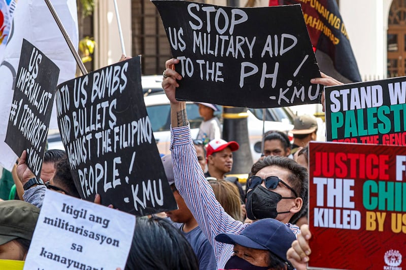 Philippine activists protesting outside the U.S. Embassy in Manila on April 11, 2024, warned that a Washington summit between the leaders of the Philippines, United States and Japan could provoke an angry response from China over the South China Sea and threaten regional stability. (Gerard Carreon/BenarNews)