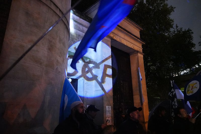 而同日下午,约10名香港示威者冒着大雨在伦敦一间五星级酒店外示威,抗议香港驻伦敦经贸办在酒店内举行一个有关香港法律及法治的研讨会。每当有疑似经贸办职员及车辆出入,示威者即上前挥舞“港独旗”和“光时旗”,高呼“关闭香港经贸办”(Shut down HKETO)等口号。