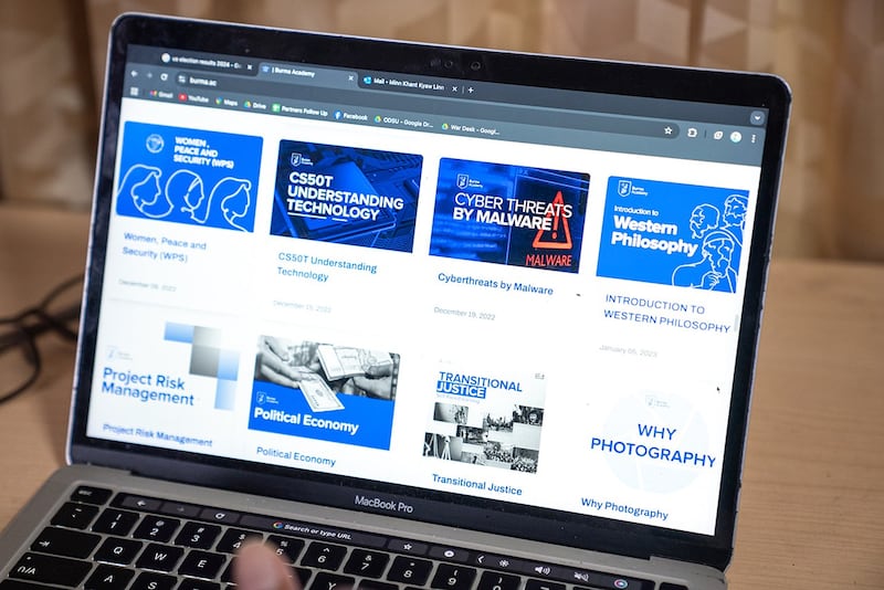 身材壮硕、留着一脸大胡子的敏坎觉林 (Minn Khant Kyaw Lim)今年26岁,他与多位志同道合的伙伴在2022年3月发起了缅甸学院线上教学计划,提供的课程内容从人权、政治理论、性别平等到战伤救护、资讯安全等专业知识齐全,并且也有英文教学、电脑程式语言、写作技巧与水电修缮等逾百种不同的课程。至今已有超过45,000名学生线上注册使用缅甸学院提供的免费课程。